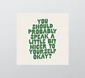 Caratterizzato da audaci scritte verdi disegnate a mano su un morbido sfondo beige, questo pezzo emana calore e autocompassione. Il contrasto sorprendente crea un punto focale che si adatta a qualsiasi stile di arredamento. Perfetto per chi vuole infondere positività e amore per se stesso nel proprio ambiente. Ideale per camere da letto, uffici o spazi abitativi, questa stampa aggiunge un delicato richiamo alle pareti. L'aspetto artigianale delle scritte conferisce all'opera un'atmosfera personale e invitante. Trasformate la vostra casa con questo pezzo edificante che incoraggia un discorso più gentile su di sé e il benessere emotivo.