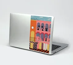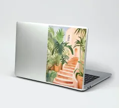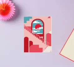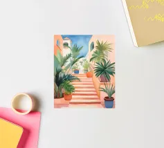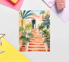 Scale rosse e vivaci conducono attraverso un edificio colorato e semplificato verso un lussureggiante ingresso ad arco, suggerendo un viaggio verso una destinazione bella ed esotica.