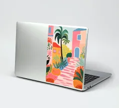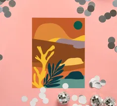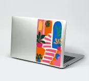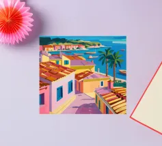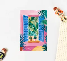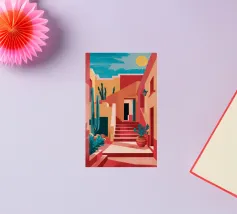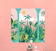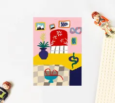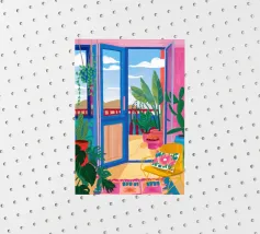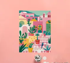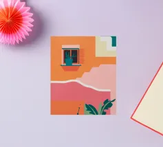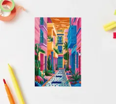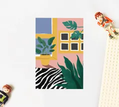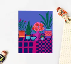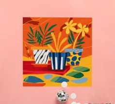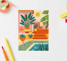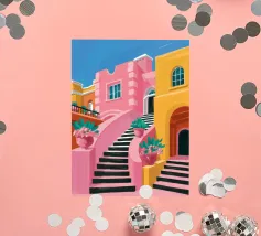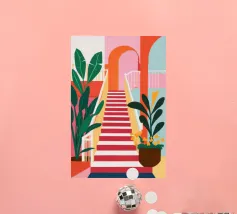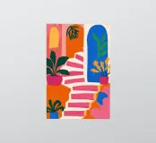 Un'illustrazione astratta mostra una scala colorata adornata da una varietà di piante in vaso, fondendo architettura e botanica in una composizione vivace e moderna.