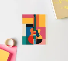 A striking abstract artwork depicting a violin in a cubist style, featuring overlapping geometric shapes and a rich color palette of earthy tones, blues, and golds. The composition emphasizes texture, depth, and movement.