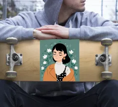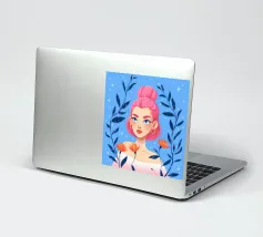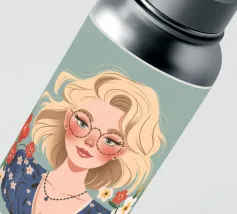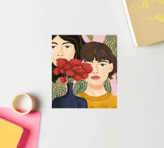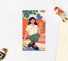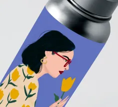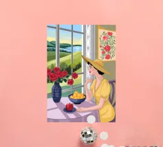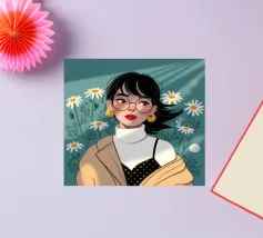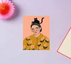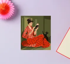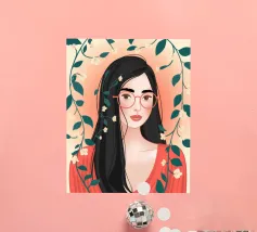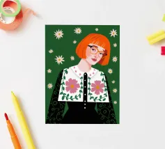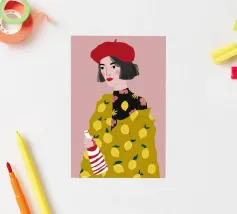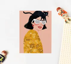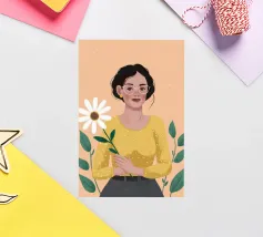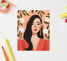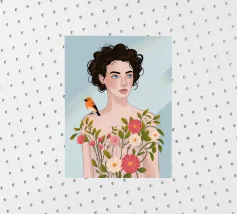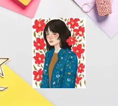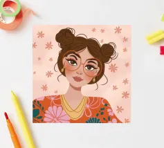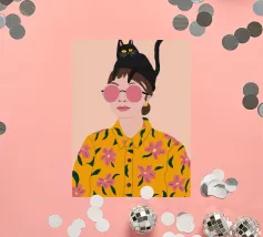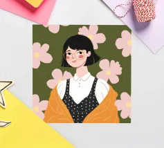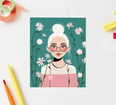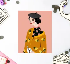 Questa opera d'arte raffigura una persona con capelli corti e biondi che indossa una giacca floreale e tiene in mano un libro. Lo sfondo giallo brillante ne esalta l'essenza chic ed elegante.