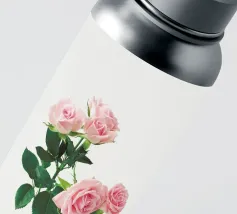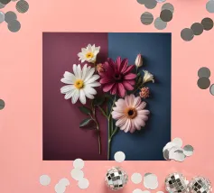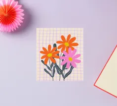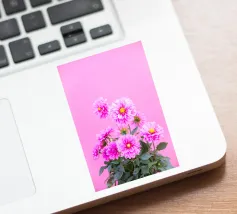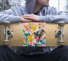 Un taccuino rilegato a spirale presenta tre fiori rosa e foglie verdi, disposti su una superficie di legno colorato, che invitano alla creatività e all'ispirazione.