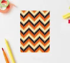 Quest'opera d'arte è un motivo a zigzag senza cuciture nei colori corallo e verde pesca. Questo disegno unico fonde un'estetica moderna con un fascino retrò. Perfetto per aggiungere un tocco di stile all'arredamento o agli accessori, dona un'atmosfera vivace e sofisticata a qualsiasi spazio. Date un'occhiata e rinfrescate il vostro look!