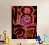 Questo intenso poster fonde estetica glitch, tipografia infuocata e una palette di colori vibranti. I numeri, distorti e aureolati in rosso, arancione, blu elettrico e nero profondo, sembrano fluttuare in uno spazio astratto e saturo di calore visivo.