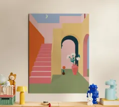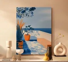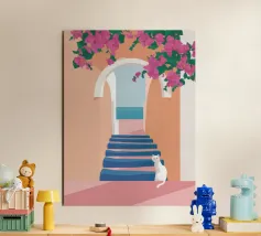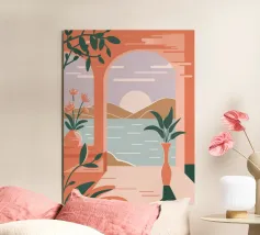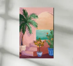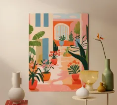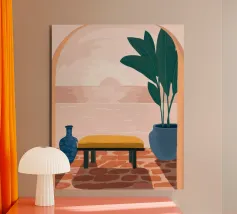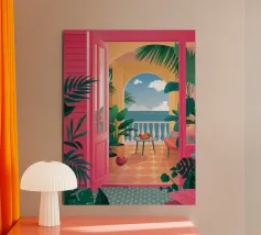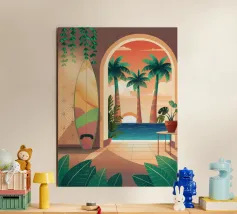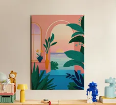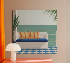 Un'illustrazione tropicale in un ambiente mediterraneo. La panchina invita a sognare in questo ambiente estivo.