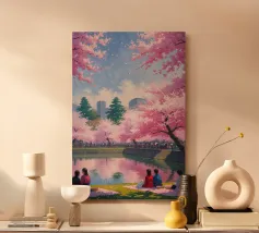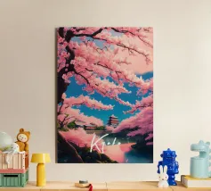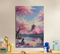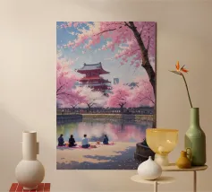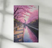 Il Sentiero dei Filosofi è immerso in morbide sfumature rosa, mentre i fiori di ciliegio raggiungono la piena fioritura. Gli argini in pietra guidano il tortuoso corso d'acqua, rispecchiando la splendida chioma floreale sovrastante. Un ponte di legno in lontananza collega i due lati, invitando i visitatori a fermarsi ad ammirare il panorama mozzafiato. Il dolce scorrere dei petali sull'acqua esalta l'ambientazione onirica, mentre l'ambiente tranquillo crea un'atmosfera meditativa. Questa scena cattura l'armonia della natura e della tradizione di Kyoto.