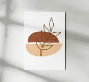 Una composizione astratta presenta un semplice sfondo geometrico marrone e beige con un delicato disegno al tratto di un ramoscello frondoso. Il design minimalista enfatizza gli elementi naturali in un equilibrio armonioso.