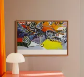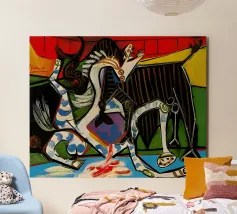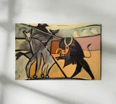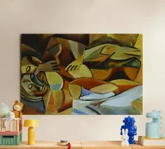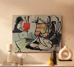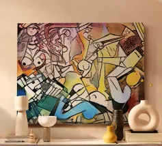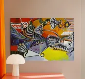 Questo dipinto astratto vibrante ed energico presenta un gioco dinamico di forme frammentate e linee audaci, con una ricca tavolozza di arancioni, gialli, viola e blu. La composizione suggerisce elementi decostruiti, forse figure o oggetti, in un movimento vorticoso ed energico, caratteristico delle influenze cubiste ed espressioniste astratte. I dettagli intricati e i colori contrastanti creano un'esperienza visiva accattivante e stimolante. Questo poster digitale di alta qualità (7000x5000 pixel, 300 dpi) cattura magnificamente l'energia grezza e il genio artistico dell'originale, ma