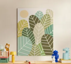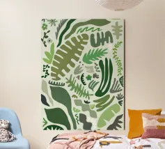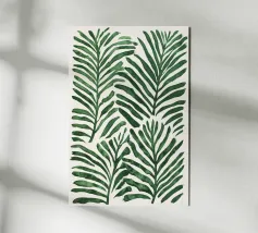 I motivi geometrici astratti a strisce verdi e gialle creano un senso di movimento nella composizione. Il disegno presenta elementi verticali di forma irregolare che suggeriscono un tema naturale.