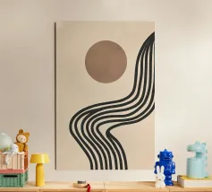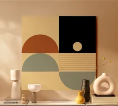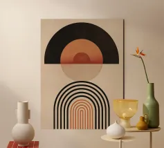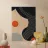 Forme e linee astratte creano una composizione avvincente, con cerchi rossi e grigi in contrasto con uno sfondo beige e nero. Le linee curve aggiungono movimento dinamico, mentre le texture maculate conferiscono profondità.