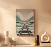 Questa interpretazione artistica astratta della ferrovia di Sylt presenta una fusione fantasiosa di natura e infrastruttura. I binari del treno tagliano dune ondulate e curve ampie di sabbia e mare, creando un contrasto ipnotico tra la rigida geometria della ferrovia e il movimento fluido del paesaggio. I blu pastello, i beige caldi e i grigi tenui conferiscono un'estetica rilassante, rafforzando l'atmosfera pacifica della costa del Mare del Nord. L'opera trasmette il viaggio sempre presente tra terra e mare, tra il mondo strutturato dei trasporti e la bellezza organica della natura di Sylt.