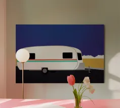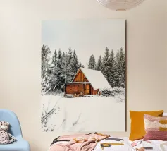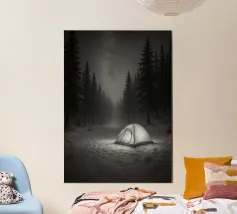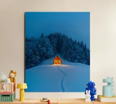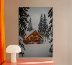Accogliente notte d'inverno in un camper nei boschi innevati, con un caldo alluminio dibond