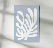 Opera d'arte minimalista con alghe bianche astratte o forme simili a coralli su uno sfondo grigio-blu tenue. Perfetto per un'estetica moderna e organica.