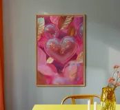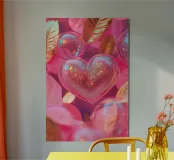 Stampa d'arte Cuore rosa con accenti oro e glitter - Quest'opera d'arte di grande impatto visivo presenta un cuore rosa scintillante su una superficie simile al vetro, circondato da foglie d'oro e bolle traslucide. I colori vivaci del rosa e dell'oro, combinati con una luce soffusa, creano un'atmosfera romantica e sognante. I dettagli intricati e le texture riflettenti dell'opera d'arte la rendono un regalo perfetto per gli amanti dell'arredamento moderno e stravagante e dell'arte romantica.