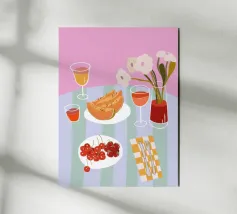 Una natura morta con una fetta di anguria, una tazza di succo di frutta e una pila di libri su una tovaglia colorata e a fantasia. La composizione è una rappresentazione fresca, intellettuale ed elegante della lettura e dei piaceri estivi.