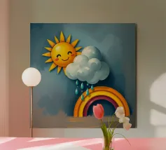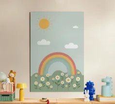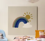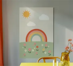 Questa illustrazione minimalista mostra un arcobaleno e nuvole bianche su uno sfondo beige, ideale per la camera di un bambino o di una bambina. Nei caldi colori della terra, il design boho solare irradia cordialità e pace. Perfetto per l'interior design scandinavo, porta un tocco di natura in casa.