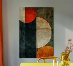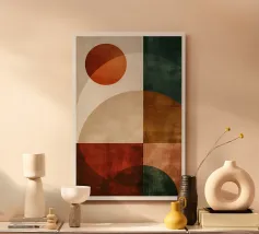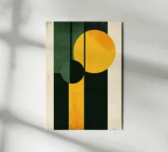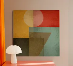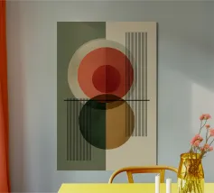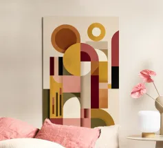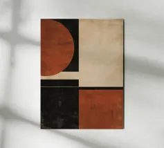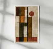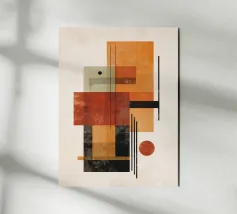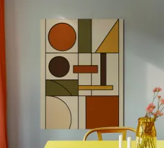 Quest'opera d'arte incarna l'essenza della geometria Bauhaus, intrecciando linee verticali e orizzontali in un gioco ritmico di equilibrio e contrasto. Le tonalità autunnali della terra - rosso ruggine, verde oliva, ocra e beige caldo - creano profondità e armonia attraverso la griglia strutturata. Minimale ma potente, cattura il dialogo senza tempo tra forma e colore, evocando sia il calore stagionale che la chiarezza modernista.