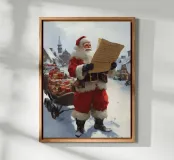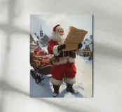 Babbo Natale si trova nel villaggio invernale innevato, assorto in una lunga lista di desideri. Dietro di lui c'è una slitta piena di regali colorati, pronta per la grande notte di Natale. La scena pittoresca irradia attesa, magia e calore: un simbolo affettuoso delle festività e dello spirito di donazione.
