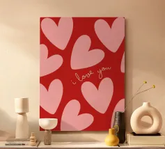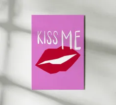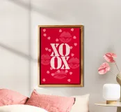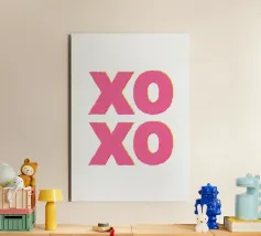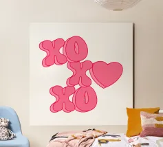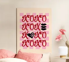 xoxo in caratteri stampatello, abbreviazione di Hugs and Kisses con cuoricini e impronte di labbra in bianco, rosso e rosa
