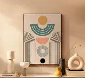 Le forme geometriche sono disposte in una composizione equilibrata con cerchi, archi e semicerchi in tonalità tenui. Il design è caratterizzato da un gioco di linee e forme che creano un senso di simmetria e armonia.