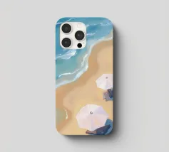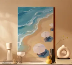 Una suggestiva veduta aerea ad acquerello mostra una vista a volo d'uccello della spiaggia: le dolci onde incontrano la sabbia dorata, mentre alcuni ombrelloni bianchi aggiungono accenti allegri. I delicati colori dell'acqua e la prospettiva minimalista creano una sensazione di estate, di relax e di leggerezza costiera, ideale per le stampe d'arte costiera moderna.