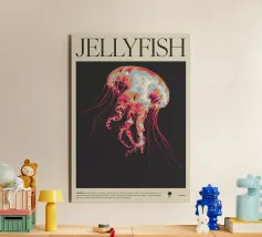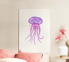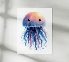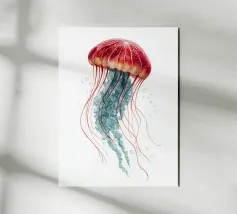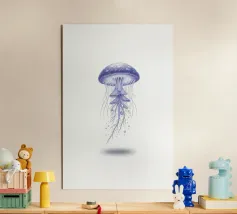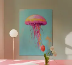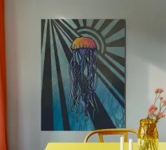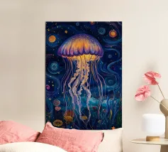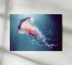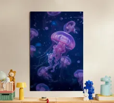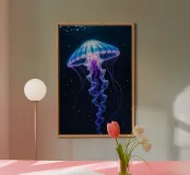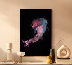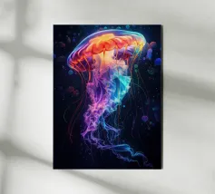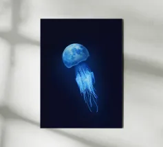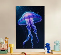 Una raffigurazione mozzafiato di una medusa d'alto mare che si muove alla deriva nelle profondità oceaniche nere come la pece. La sua campana trasparente emana un bagliore pulsante blu e viola, mentre i suoi delicati viticci nastriformi ondeggiano con un movimento aggraziato. Minuscole particelle di luce fluttuano intorno, imitando la bellezza celestiale di un cielo notturno oceanico. Questo dipinto evidenzia la meraviglia surreale delle creature marine bioluminescenti, fondendo il realismo con un'estetica quasi onirica. Il contrasto tra la luce radiosa e i profondi abissi esalta la presenza eterea e ultraterrena della medusa.