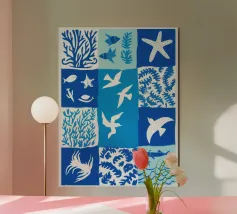 Immergetevi in "Blue", dove l'essenza del mare è catturata attraverso uno spettro di accattivanti tonalità di blu. Quest'opera d'arte riflette la superficie tranquilla dell'oceano e le sue misteriose profondità, mescolando le tonalità per evocare serenità e meraviglia. Perfetto per chi apprezza il fascino rilassante del mare.