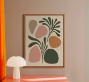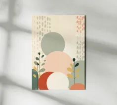 Una miscela armoniosa di natura e astrazione moderna, questo disegno presenta una foglia delicata completata da forme morbide e organiche in una tavolozza di colori pastello. Perfetto per aggiungere un tocco di tranquillità ed eleganza a qualsiasi spazio, questo pezzo di ispirazione boho incarna semplicità ed equilibrio.