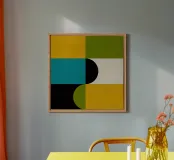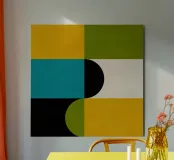 Ispirata all'estetica moderna del Bauhaus e della metà del secolo scorso, questa opera d'arte presenta audaci blocchi geometrici in giallo, verde, blu, nero e bianco sporco. Le sue linee pulite e i forti contrasti catturano l'armonia senza tempo del design modernista.