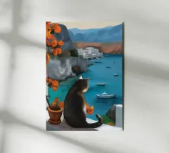 Grazioso dipinto digitale di una donna sicura di sé in una fluente vestaglia bianca seduta su una spiaggia rocciosa con palme e un vibrante sole arancione. Questa elegante e serena scena costiera evoca lusso, calma e vibrazioni tropicali. Perfetto per gli amanti della moda, dell'arte moderna e dell'arredamento tropicale. Aggiunge raffinatezza e calore a soggiorni, camere da letto e uffici. Regalo ideale per i collezionisti d'arte e gli appassionati di ritratti contemporanei ispirati alla spiaggia.