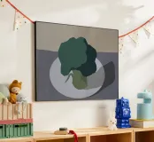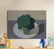 Una rappresentazione semplicistica di broccoli poggia su un piatto bianco su uno sfondo bicolore, con sfumature di verde e grigio. Lo stile astratto enfatizza le forme geometriche e i colori piatti.