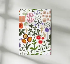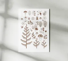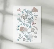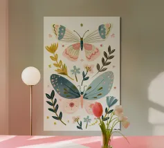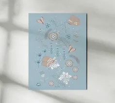 Delicate falene e farfalle che volano e si posano sui fiori. Foglie ondulate si intrecciano con spighe d'erba. È una scena immaginaria che ricorda una bella e calda giornata nella natura, rappresentata in una tavolozza di colori blu, grigio e beige.