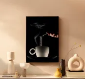 cup coffee spoon steam sugar white porcelain saucer hot beverage black background ceramic holding spoon pouring sugar granules drinking vessel morning routine caffeine ceremony kitchenware aroma beverage preparation
