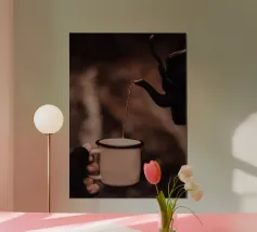 coffee coffee beans strainer cup steam copper pot coffee filter pouring hot beverage wooden board chocolate pieces table kitchen setting hands mug dark background steam rising cooking process morning drink brew
