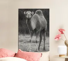 Portrait of a camel. In black and white. Walking through the desert in Ethiopia. Animal in the nature of the Danakil depression in Africa.