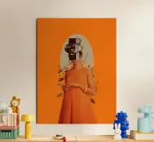 c'è una fotografia nella mia testa che contiene ogni ricordo di te. ~ una donna che indossa un abito arancione con macchina fotografica vintage come una testa vibrante sfondo arancione con elementi floreali retrò.