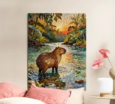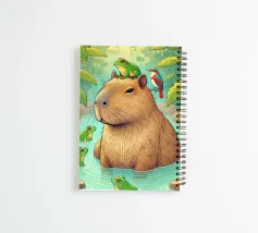 A capybara relaxed in a hot spring, surrounded by little birds perched on its head and frogs hopping on its legs.