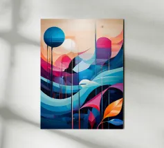 A captivating abstract artwork that blends organic and geometric elements. Lush foliage intertwines with celestial bodies and architectural forms, creating a sense of harmony and balance. The muted color palette and intricate details invite contemplation and exploration.