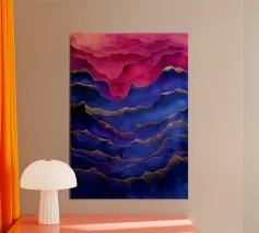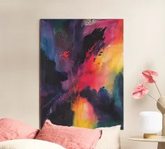 This vibrant abstract painting features a dazzling interplay of reds, purples, and gold, evoking a sense of cosmic energy and celestial beauty.