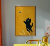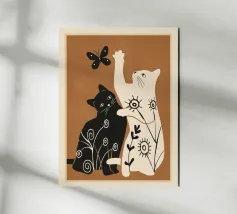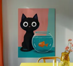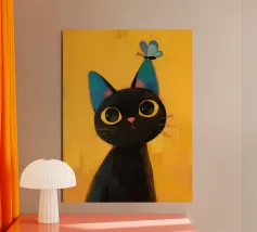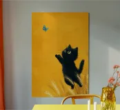 Un tranquillo momento di meraviglia catturato in movimento. Chasing Light ritrae un piccolo gattino nero sospeso tra terra e cielo, proteso verso una fugace farfalla blu. Su uno sfondo caldo e dorato, la scena evoca l'innocenza, la curiosità e il desiderio universale di toccare qualcosa che è appena fuori portata. La pennellata strutturata e il delicato contrasto tra la pelliccia scura e la luce radiosa creano un senso di morbidezza e calore emotivo. Quest'opera d'arte bilancia la giocosità con l'immobilità poetica, rendendola un pezzo affascinante e riflessivo che invita alla riflessione e alla gioia.