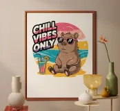 Un capibara rilassato con gli occhiali da sole si sdraia su una spiaggia con un drink tropicale e un vibrante tramonto sullo sfondo. La frase "Chill Vibes Only" è ben visibile accanto al capibara.
