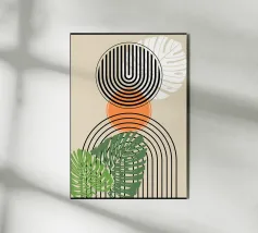 Le forme geometriche nei toni del verde terra sono completate da linee nere decise e da elementi astratti a forma di foglia. La composizione crea un'estetica equilibrata e moderna.