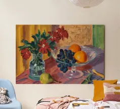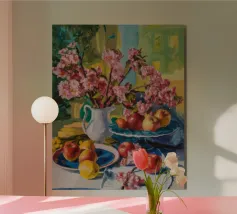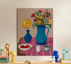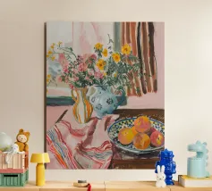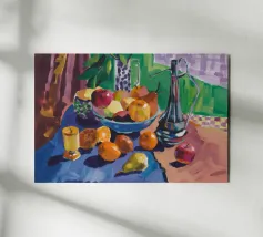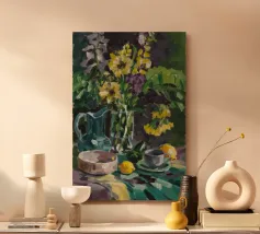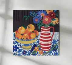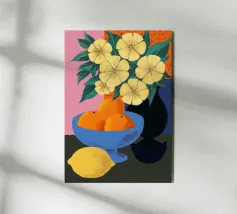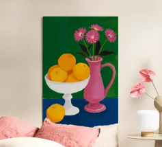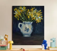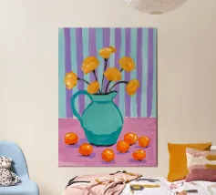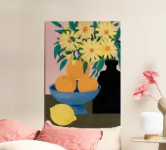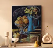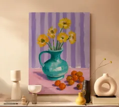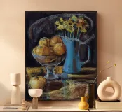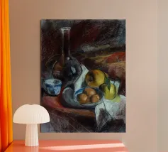 Un disegno a pastello espressionista di un vaso di arance e blu con fiori potrebbe rappresentare il soggetto con tratti decisi e ampi e una tavolozza di colori vibranti ed esagerati su uno sfondo scuro. Il vaso arancione irradia calore, mentre gli accenti blu contrastano dinamicamente, creando un senso di profondità ed energia. I fiori spuntano dal vaso in forme espressive e poco definite, con petali e foglie in intense tonalità di giallo, che si mescolano leggermente per trasmettere movimento e vitalità. Le ombre e le luci sono intensificate, conferendo alla scena una qualità onirica.
