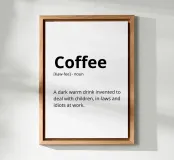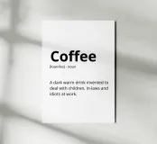 Una definizione umoristica del caffè lo descrive come un rimedio necessario per affrontare le sfide quotidiane come i figli, i suoceri e i colleghi. Il testo imita scherzosamente una voce del dizionario con l'ortografia fonetica e la parte del discorso.