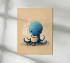 Un bizzarro mostro viola con denti aguzzi, occhi gialli e un sorriso malizioso che stringe una tazza di caffè blu. Il giocoso stile da cartone animato aggiunge un'atmosfera divertente e stravagante, perfetta per progetti umoristici o a tema caffeina.
