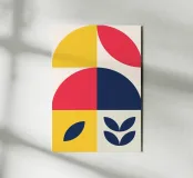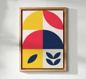 Un poster astratto e accattivante che unisce una geometria pulita a forme organiche sottili, ricordando gli stili Bauhaus e Mid-Century Modern. Il disegno utilizza una tavolozza audace e contrastante di blu marino intenso, giallo brillante e rosso vivace su uno sfondo crema chiaro, creando un effetto blocco di colori di grande impatto visivo. La composizione è divisa in quattro sezioni principali, caratterizzate da grandi semicerchi, forme curve simili a petali o foglie e piani di colore che si intersecano. Questa opera d'arte minimalista ma dinamica è perfetta per uno spazio contemporaneo. Questo download digitale ad alta risoluzione (7000x5000 pixel, 300