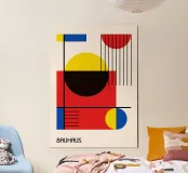 Un dinamico poster astratto Bauhaus che celebra la geometria pura e i colori primari. Il disegno integra magistralmente rettangoli rossi, cerchi gialli e blu e audaci linee nere in una composizione di grande impatto. Gli elementi includono un grande quadrato rosso sovrapposto a un cerchio nero parziale, un cerchio giallo pieno e barre nere verticali che creano tensione visiva. Questo pezzo racchiude magnificamente lo spirito modernista e costruttivista. Questo poster digitale viene fornito con una risoluzione superiore di 7000x5000 pixel a 300 dpi, assicurando una qualità di stampa eccezionale per una dichiarazione audace nei vostri interni moderni.