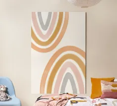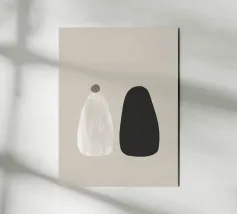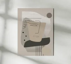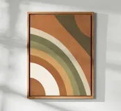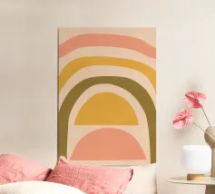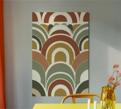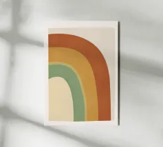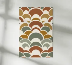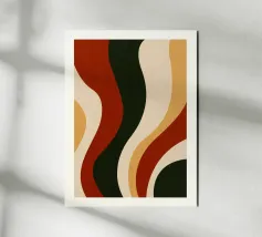 Un'opera d'arte astratta nostalgica con linee curve e fluide in arancione polveroso, giallo, verde salvia, marrone, beige e bianco. Ispirata al design degli anni '60 e '70, aggiunge un caldo tocco retrò a interni moderni, boho o eclettici.