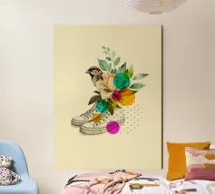 Una nostalgica stampa d'arte a collage che unisce fascino vintage e romanticismo. Un grammofono ornato esplode di fiori vivaci e dischi in vinile, mentre una coppia che balla cattura la magia della musica senza tempo. Un'opera d'arte da parete perfetta per gli amanti della musica, per gli appassionati di arredamento retrò o per chiunque sia attratto dalla narrazione di storie sentimentali attraverso il design.