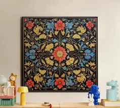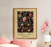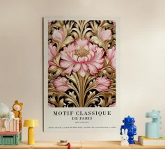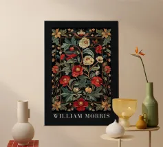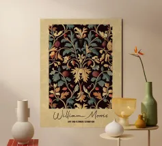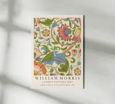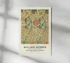 Questa raffinata opera d'arte di William Morris presenta un motivo floreale nei toni tenui dell'oro, del beige, del rosa e dell'arancio che celebra la bellezza senza tempo della natura. Con il suo stile distintivo e l'elegante tipografia, incarna la fusione di arte e design che Morris ha reso popolare in epoca vittoriana.